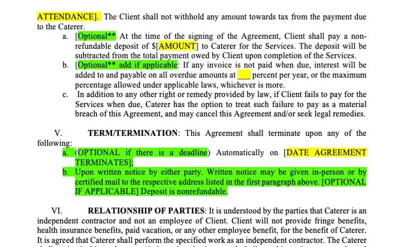 This agreement is for a person/company to give clients for catering services. Customer/client (person hiring for food) may also give this to the person/company providing the service. This Agreement helps establish the arrangement between a customer and client who needs catering services, including payment terms, termination, and enforcement of the agreement. This document clarifies details such as payment; termination; and enforcement of the agreement.