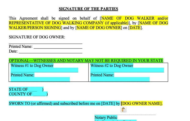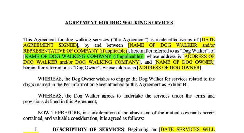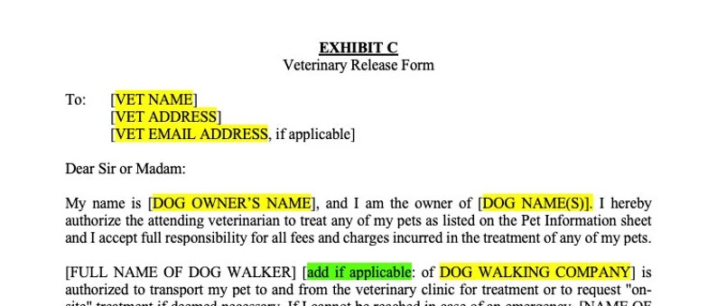 This agreement is for a person/company to give clients for dog walking services. A dog owner may also give this to the person/company providing the Service. This Agreement helps establish the arrangement between a pet owner and a dog walker or company for services whenever help is needed. This document clarifies details relating to payment; cancellation policy; and veterinarian release form for taking the pet in case of an emergency.