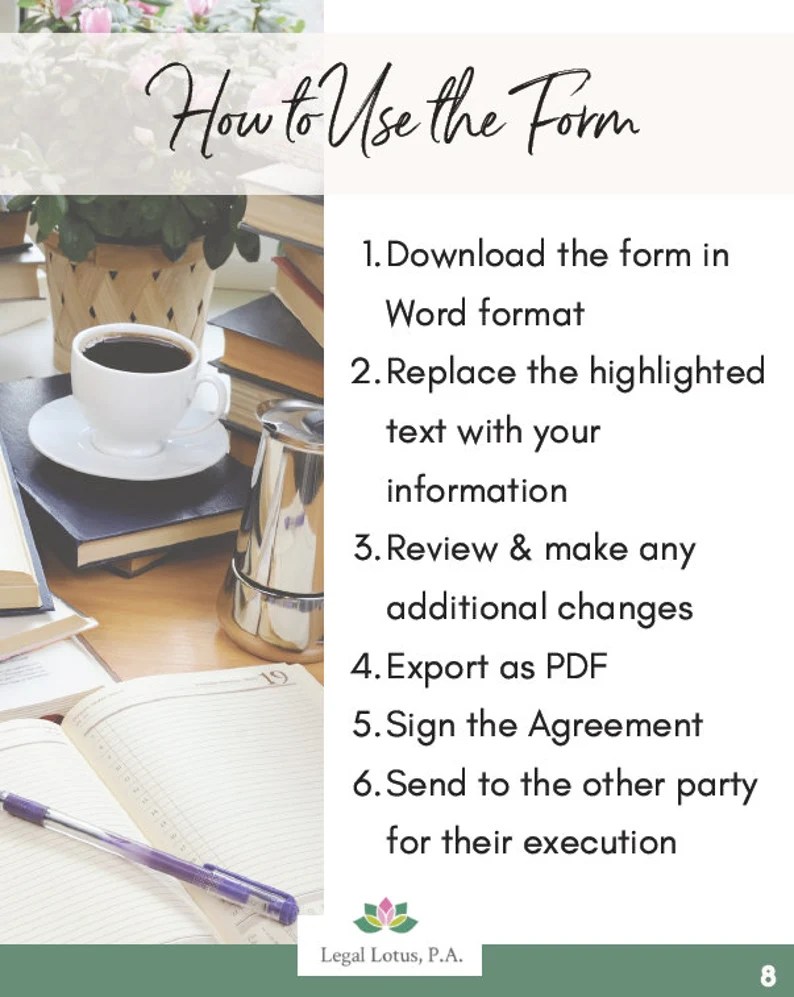 Our attorney-prepared agreement is legally binding and has been tested and refined through years of practice. With easy-to-follow instructions, you can quickly download the template, replace the highlighted text with your information, review and make any necessary changes, export it as a PDF, and send it to the other party.